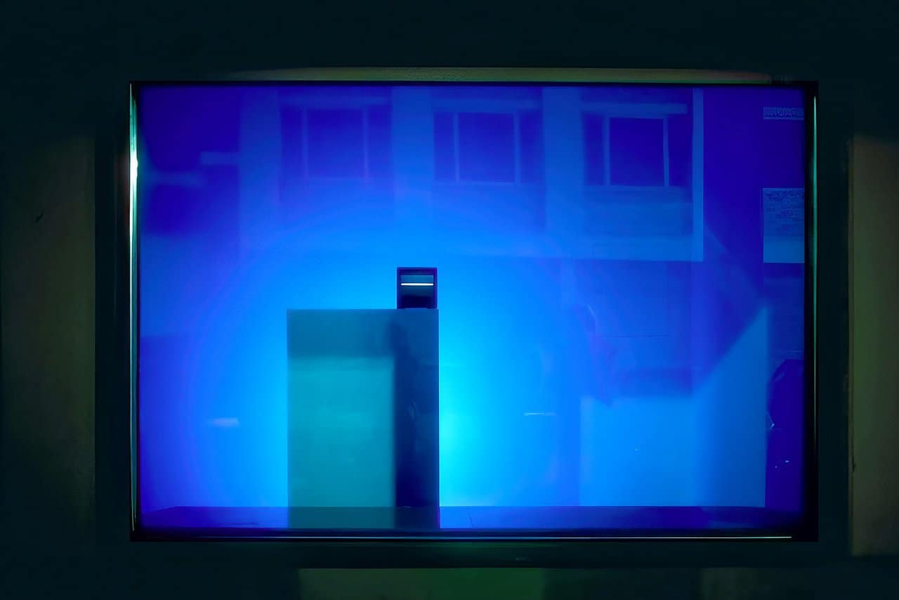 Two color monitors faced the white walls, casting spellbinding digital light pulses, generated through algorithmic instructions on a TI-99/4A computer. The installation was fed by these algorithmic instructions, producing a mesmerizing interplay of light and sound that illuminated the space and the surroundings after dark. A small black and white monitor faced the audience, showcasing the same sequence of pulses. These mesmerizing light patterns not only released the space from its physical confines but also propelled it towards the threshold of the subliminal and into the realm of the superluminal, approaching the barrier of light itself, known as faster-than-light (FTL) existence.
