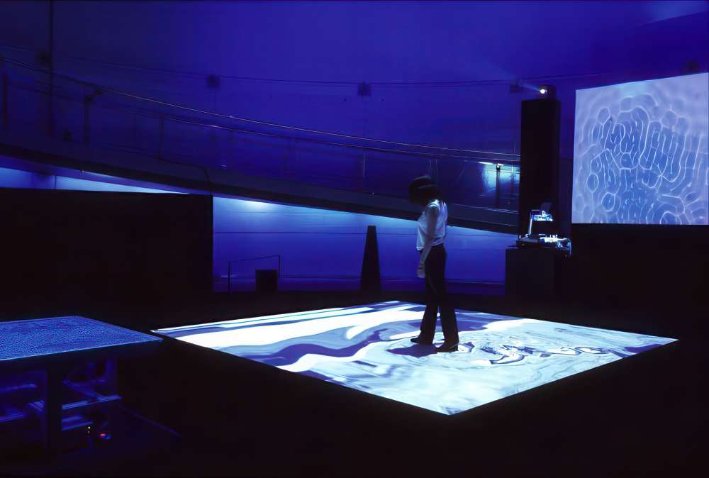 …The video installations, characterized by their intricate complexity, effectively embody the seemingly straightforward aspiration to translate the latent energy within digital imagery into palpable, physical forms, thereby allowing participants to actively engage with the artwork. For instance, in the installation R111, set upon a vast sound stage adorned with digital projection, participants manipulate the environment with their movements, eliciting distinct graphic sensations and effectively “playing” with the installation. As the artist himself articulates, the screen constantly evolves, presenting an array of graphic sensations and newly generated images and sounds, facilitated by the intricate workings of millions of computer chips and fluid structures. In the second project, Plasma, observers can directly influence both the sound and imagery through their movements, engendering a symbiotic digital dialogue with their alter-ego. Plasma serves as a prime example of the seamless conversion of virtual energy into tangible material, encapsulated in the digital manifestation of “supreme particles.”