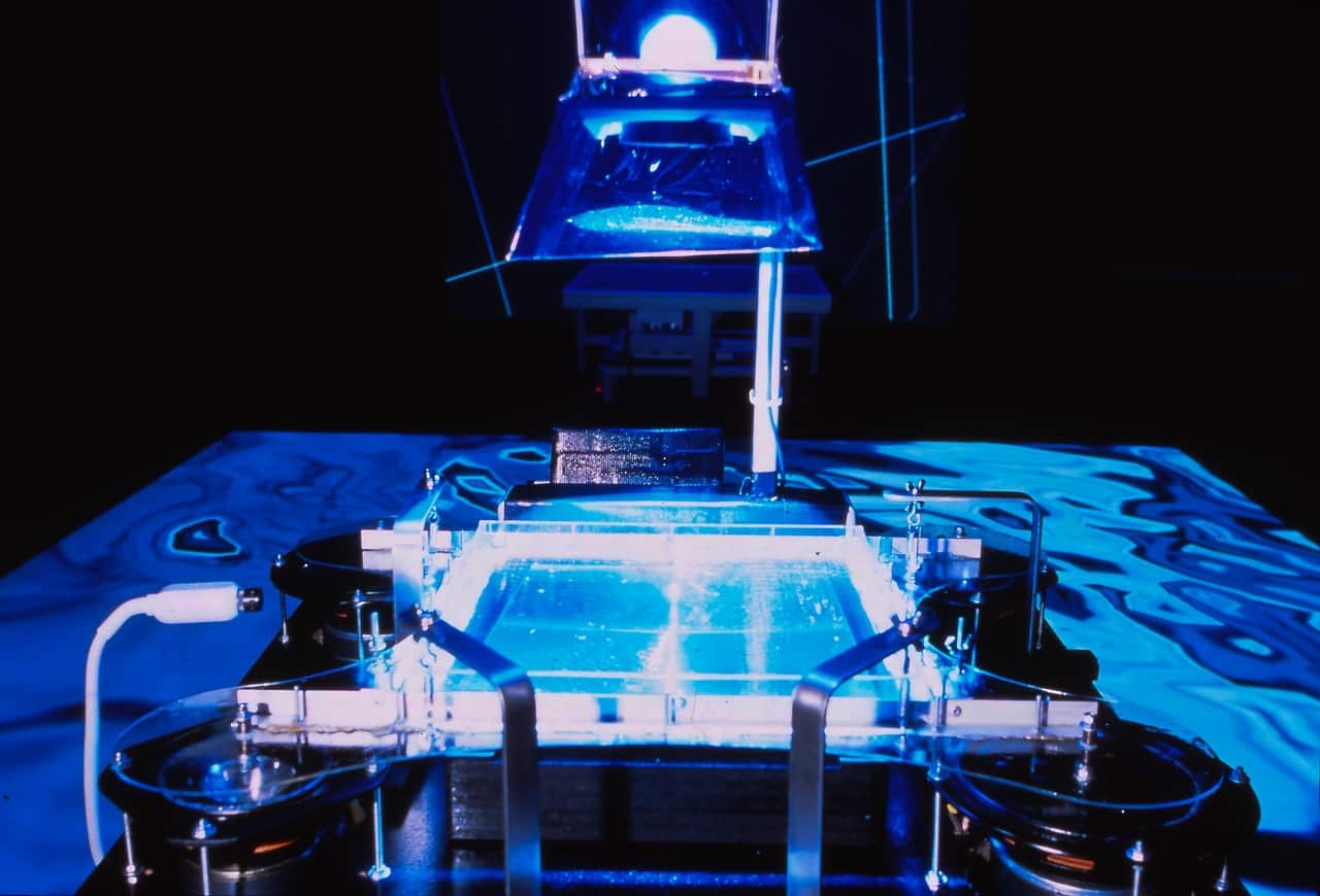 Analogously, the numerous iterations of the spatially encompassing interactive environment R111 (1996–2001) transduced human presence into nonhuman materialities. “Energy potentials” were, in Saup’s words, “cannibalized off the Internet and from the local movement of spectators . . . and then transformed into various states of matter — both physical and virtual — and presented by the installation with the help of physical and virtual modules” (figure 8.5). Harnessing data from a wide range of sources, R111 provocatively fused the computation and physical, “choreographing particles of matter as if they were pixels” and translated gathered “sensations” not only into the typical interactive liquid morph of the image, but also into the physical waves of infrasonic sound, the vibration of silicon oil, and the shifting of magnetic particles, all installed on tables in the space (Saup 1999).