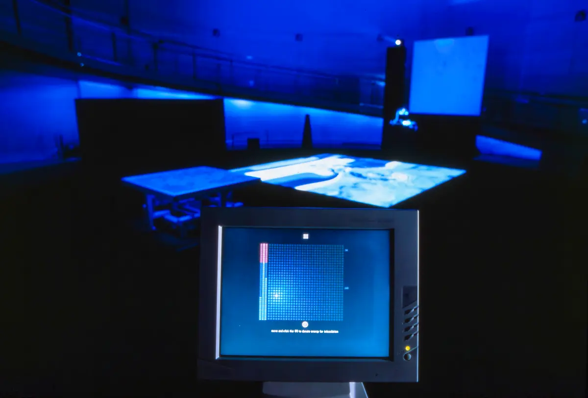 At the center of the multi-part and multi-room work “R111” (1999), a sensor-controlled sonic floor surface in the atmospherically dense cellar spaces generates internet data-fed architectures on a projection surface and monumental sound effects.