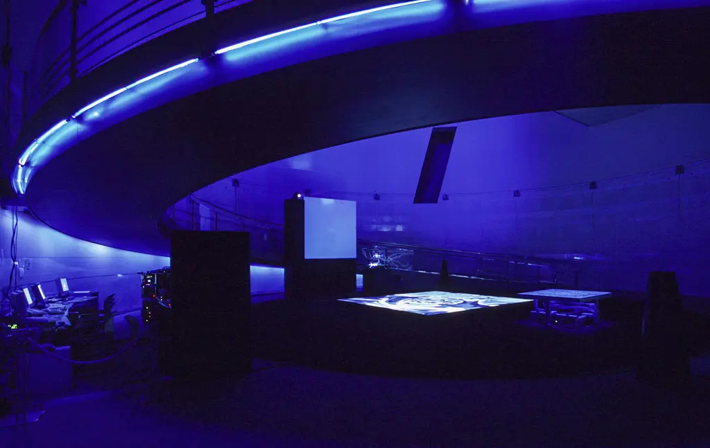 The sonic floor is the main local interface. Spectators can walk on top of the sonic floor. It consists of a subwoofer-matrix that transmits energy back to the spectator through vibrational forces induced by infrasonic sound waves. Any spectator moving on the sonic floor is tracked by a motion-tracking camera and therefore creates energy through movement for the system. As the spectator moves, they leave traces on a liquid surface projected onto the sonic floor.